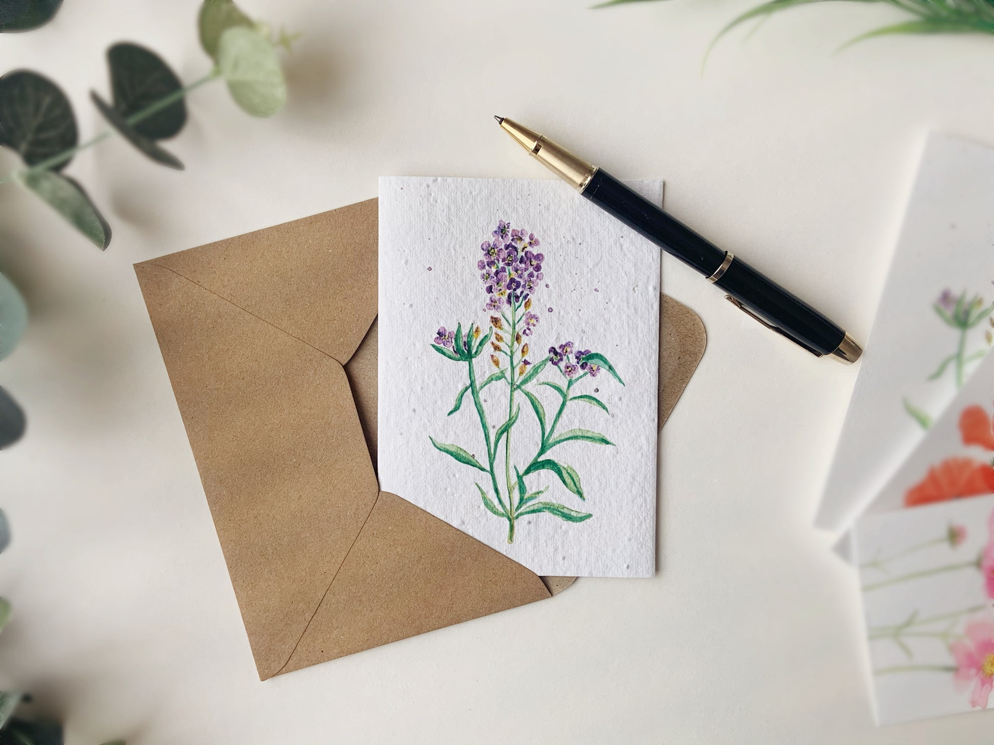 Each card comes in eco friendly packaging, as seen photographed. This consists of a recycled kraft envelope and sleeve.